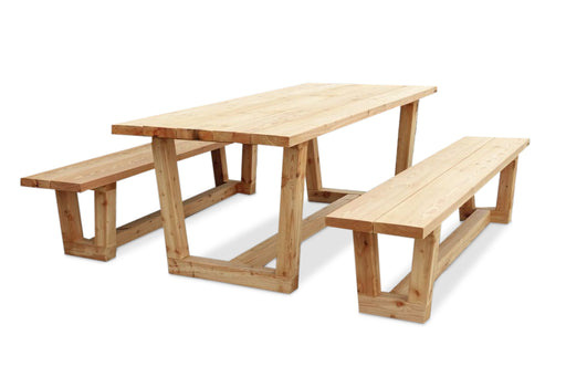 Robuuste en strakke tuinset van Douglas hout. De tuinset bestaat uit een houten terrastafel en twee banken zonder rugleuning. De houten tuinset wor...