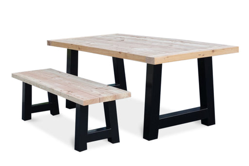Tuinset uit de collectie Jones van het duurzame Lariks/Douglas hout in combinatie met zwarte (of witte) A-stalen poten. Het blad wordt met een lijs...
