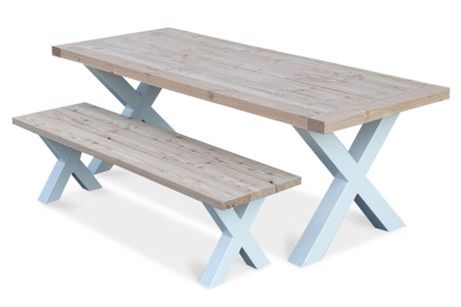 Tuinset uit de collectie Rustiek van het duurzame Lariks/Douglas hout in combinatie met zwarte of witte stalen kruispoten. Het blad wordt met een l...