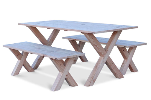 Robuuste en strakke tuinset van Douglas hout. De tuinset bestaat uit een houten terrastafel en twee banken zonder rugleuning. De houten tuinset wor...