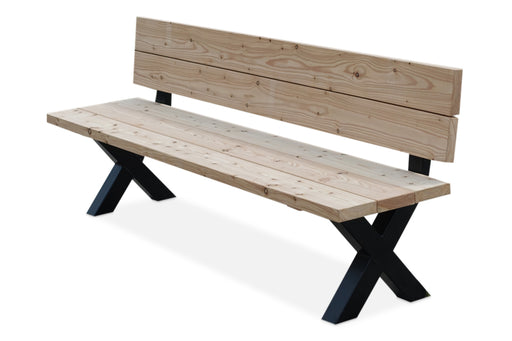 Tuinbank uit de collectie Rustiek met een zitting van het duurzame Lariks/Douglas hout en zwarte stalen kruispoten. De zitting van de bank wordt st...