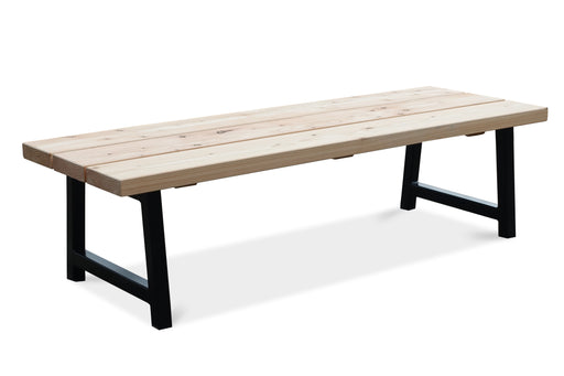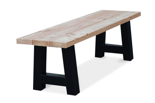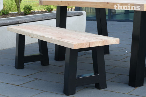Tuinbank uit de collectie Jones met een zitting van het duurzame Lariks/Douglas hout en zwarte stalen A-poten. Het zitting van de bank wordt standa...